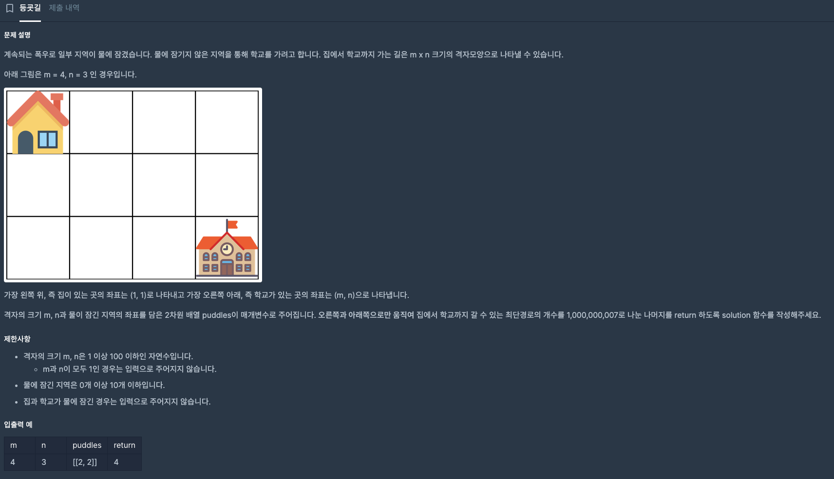 그리고 문제를 보면 알겠지만 puddles 좌표의 x,y좌표 값이 우리가 사용하는 이중리스트의 좌표와는 반대로 주어졌기 때문에 이를 바꾸어 주어야한다.