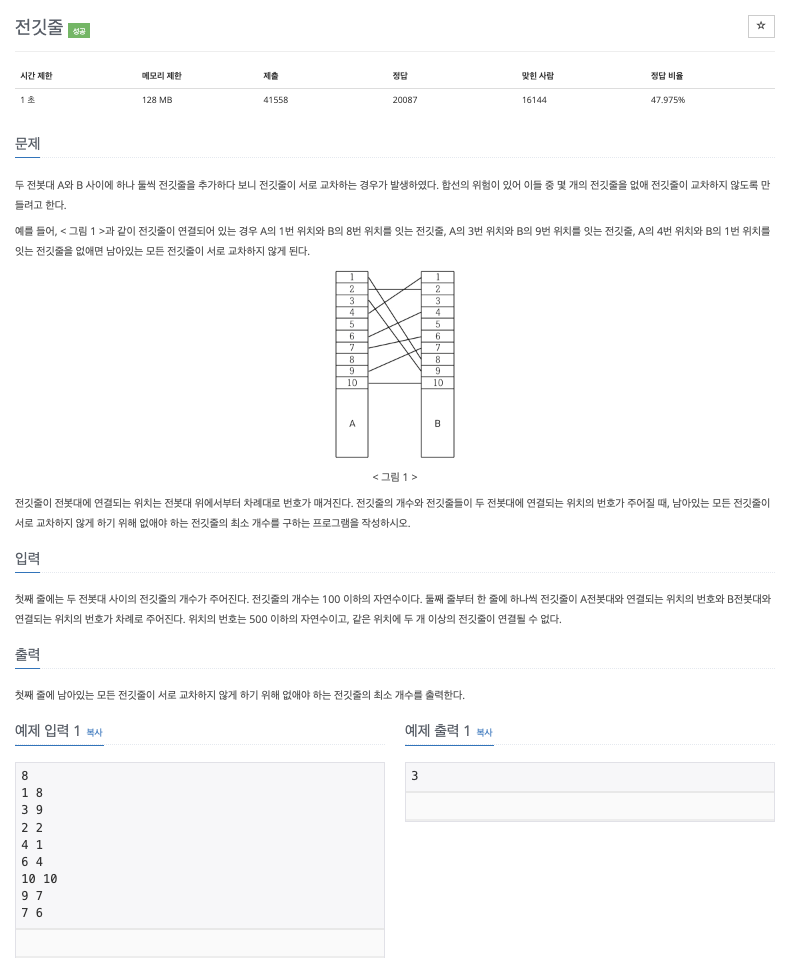 그러니 교차하지 않는다 = 증가 수열 이 되고 전선의 개수를 최소로 제거할 때는 증가수열이 최장 증가수열이 될 때 이다.(전선을 최소로 제거하면 남는 증가 수열은 최장증가수열이 되기 때문)