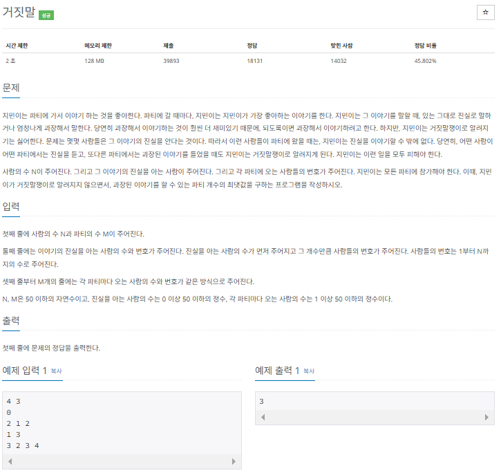 문제를 읽으면 알 수 있듯이 진실을 아는 사람이 파티에 속해있으면 진실을 몰랐던 사람도 이 파티에서 지민이가 진실을 말하기때문에 진실을 아는 사람이 된다.