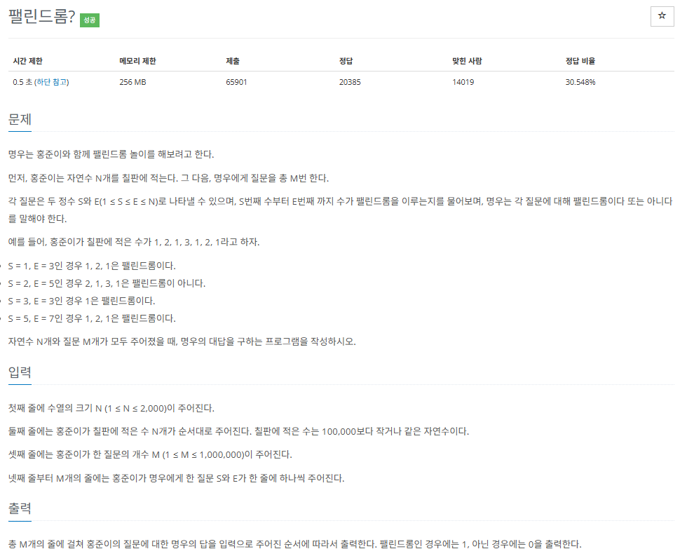 길이가 3이상인 부분배열이 팰린드롬을 만족할라면 s와e 사이에 있는 s-1 ~ e-1 구간의 부분배열이 팰린드롬을 만족해주어야한다. 그리고 s랑 e가 같아야지 s ~ e구간의 부분배열이 팰린드롬을 만족하는게 된다.