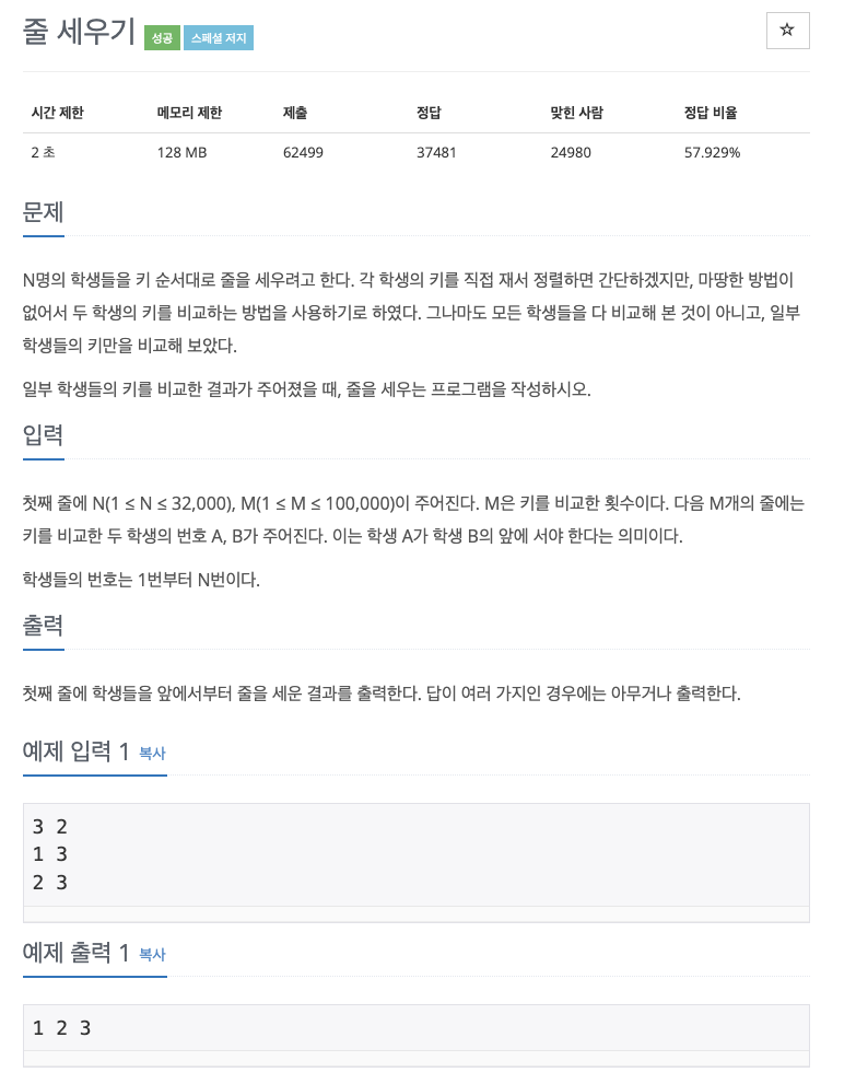 이 문제를 풀기 위해서는 먼저 위상정렬이라는 개념을 알아햐한다