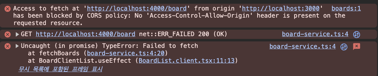 실습을 진행하면서 next.js 로 클라이언트를 구성하고 클라이언트에서 express에서 구현해놓은 API를 요청하도록 해주는 작업을 진행하였다. 그리고 마주한 CORS 에러...