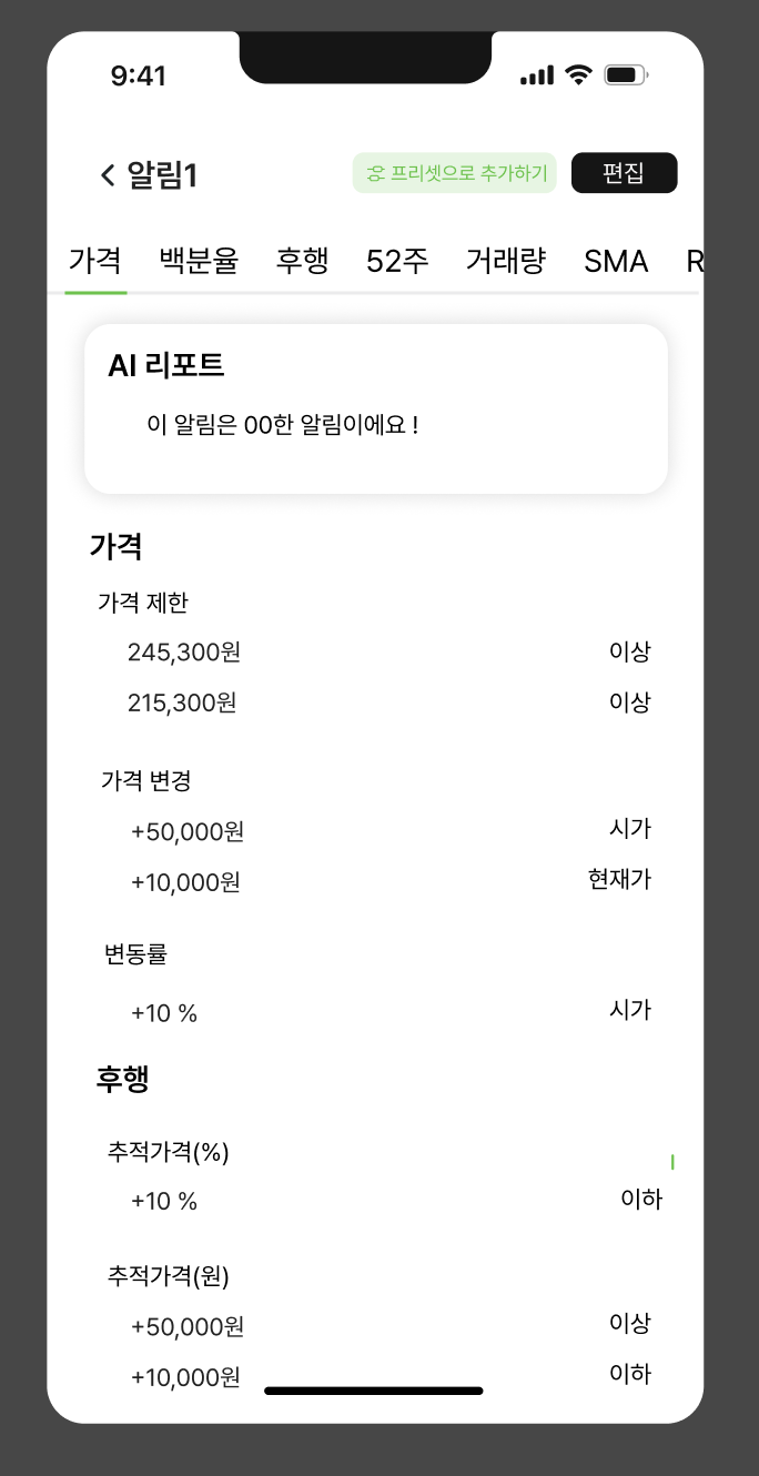 그리고 알림설정에서 프리셋을 가져올 수 있는데 이때 사용자가 설정해둔 프리셋을 가져올 수도 있고 우리가 넣어둔 유명인이 자주 사용하는 지표 프리셋을 사용할 수 도 있다.