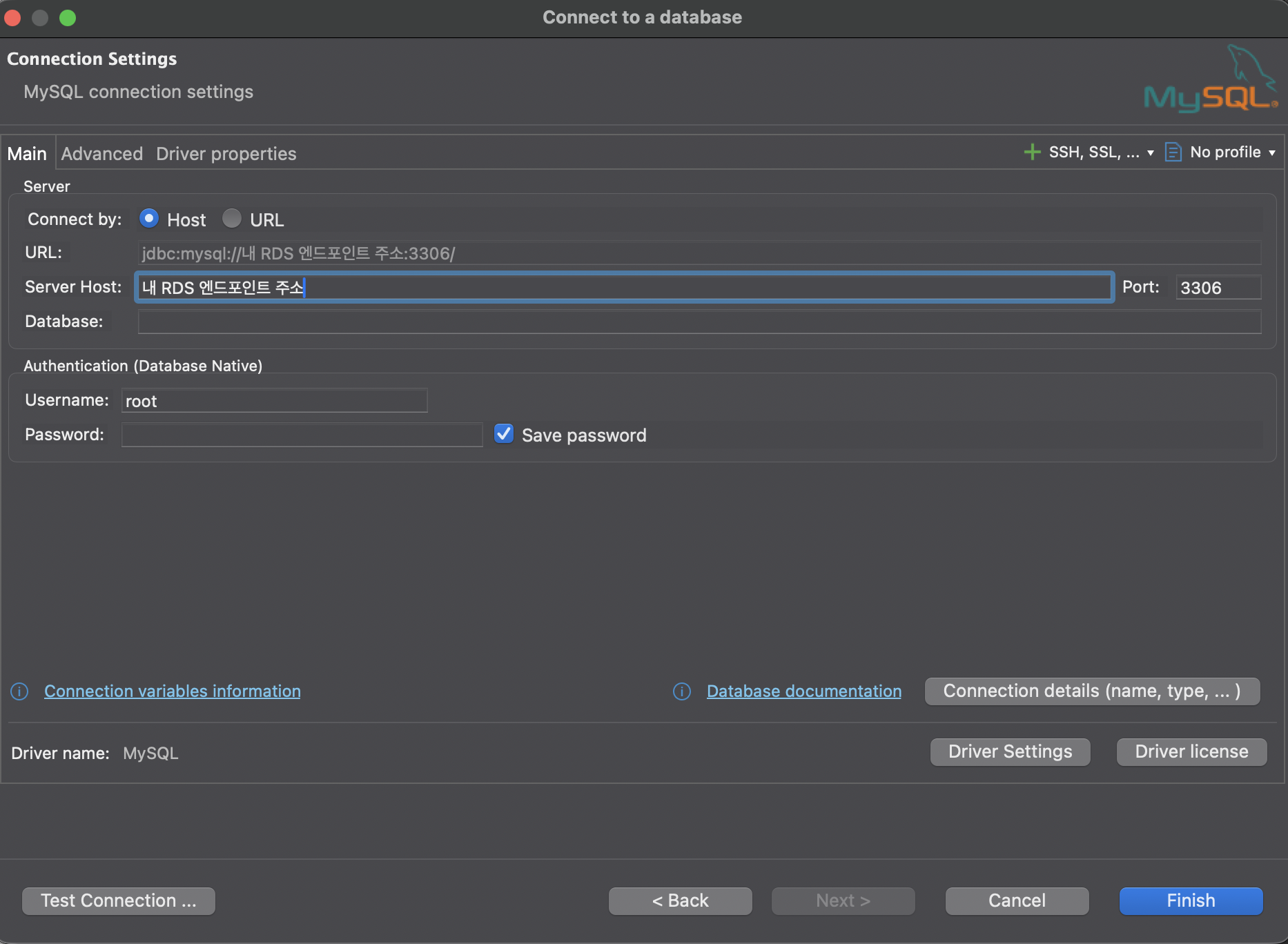 1. Server Host 부분에 RDS 엔드포인트 주소를 넣어준다.