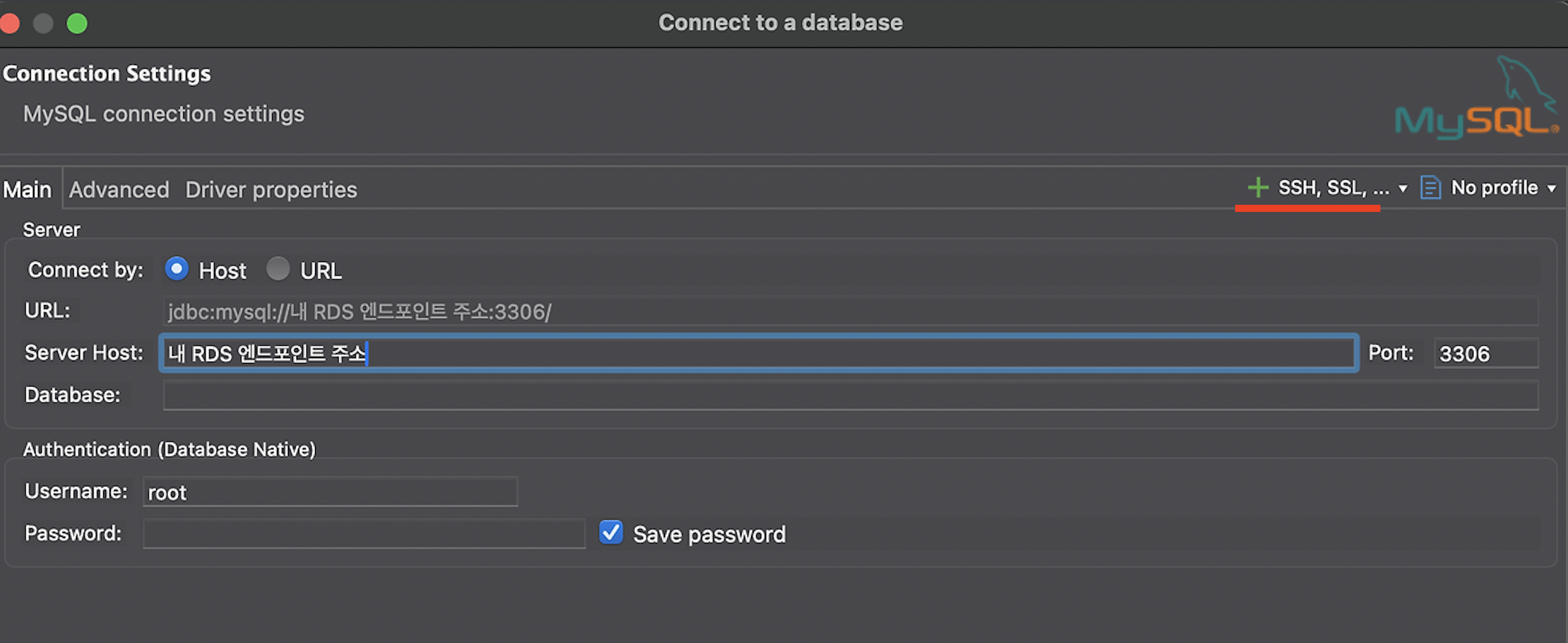 3. Password 부분에는 rds 를 만들면서 넣은 password