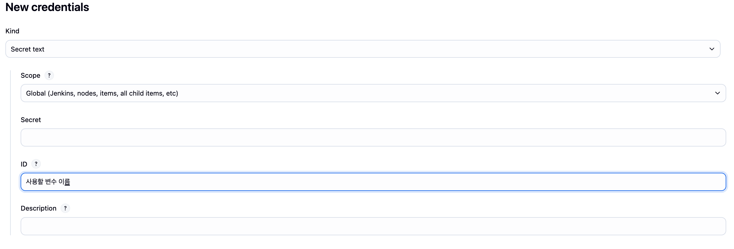 secret 부분에 변수 값을 넣고 ID에는 변수 이름을 넣어주면된다.